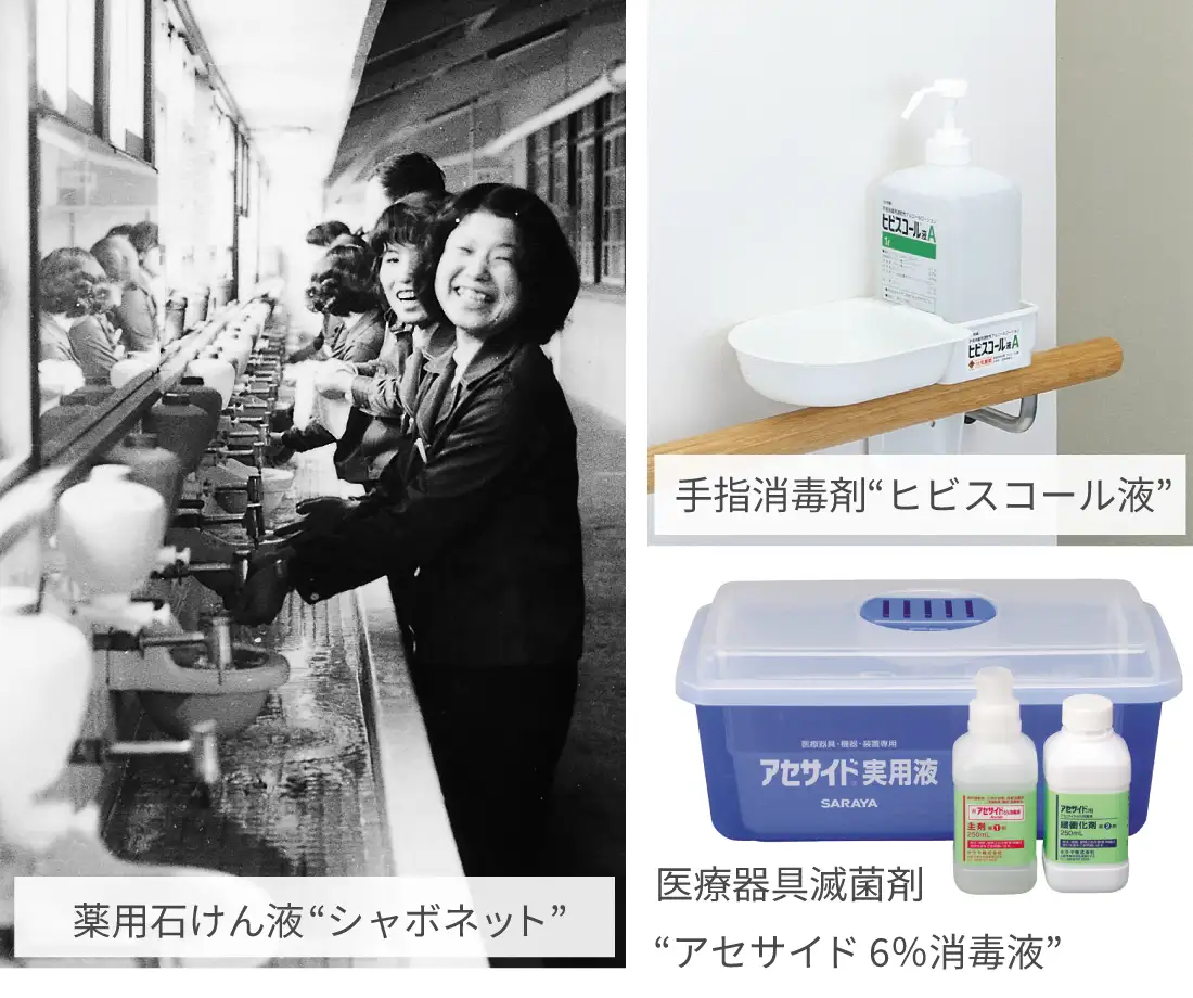1952年創業から、サラヤは手を洗うと同時に殺菌・消毒できる、植物性の薬用石けん液にはじまり、医療現場におけるアルコール手指消毒剤や、安全性の高い医療機器具の滅菌消毒剤などの医薬品を開発してまいりました。